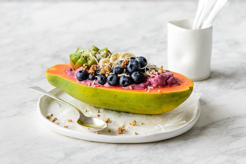 Spoon smoothie into de-seeded papaya half and garnish with your choice of toppings. Serve immediately.