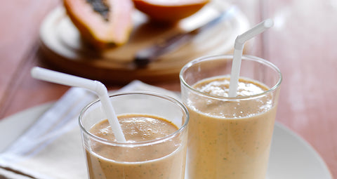 Peel and deseed red papaya. Cut into chunks. Place fruit and all other ingredients in a blender or food processor, blend until well combined and frothy.?Taste to determine if honey is required for extra sweetening. Add if needed and re-blend.?Pour into glasses and serve.