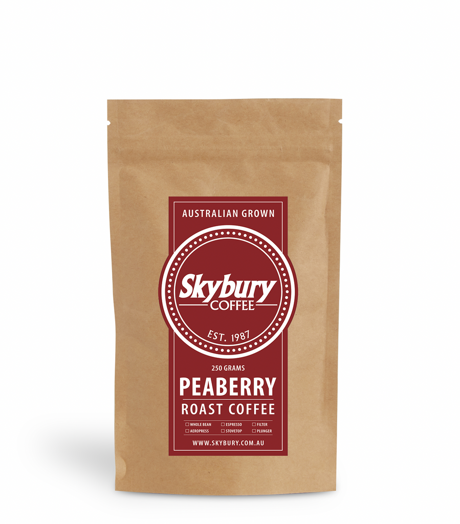 Peaberry is a different and rare type of coffee bean. Skybury peaberry has a higher density with a concentrated flavour, aroma and a distinct acidity. Our peaberry is roasted as a medium to ensure that these flavour characteristics are not lost in the roasting process.